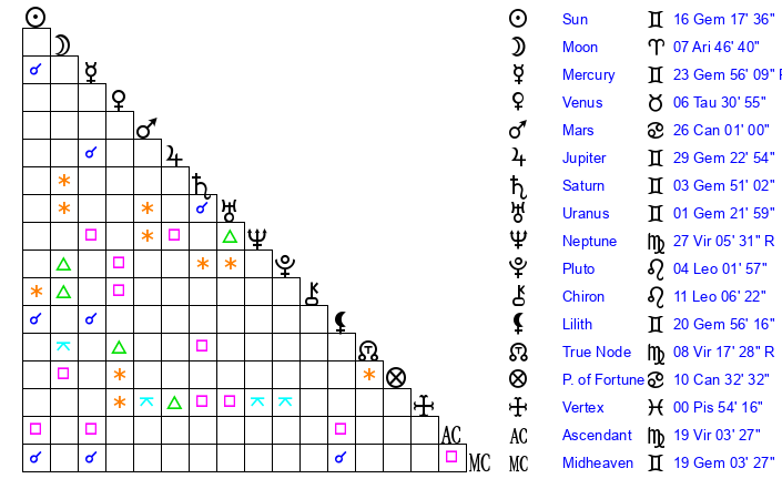 | Sun | 16 Gemini 18 | 17 Gemini 12 | 5 Virgo 42 |