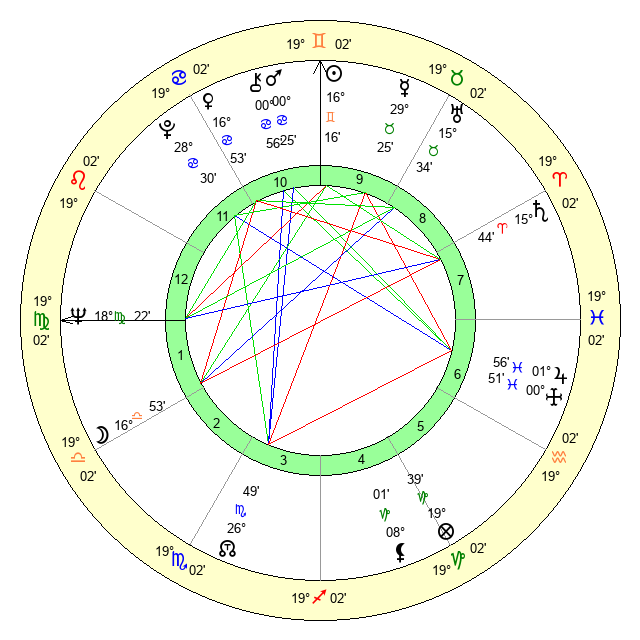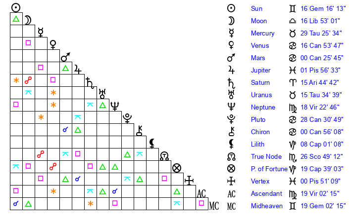 | Sun | 16 Gemini 16 | 17 Gemini 12 | 9 Virgo 33 |