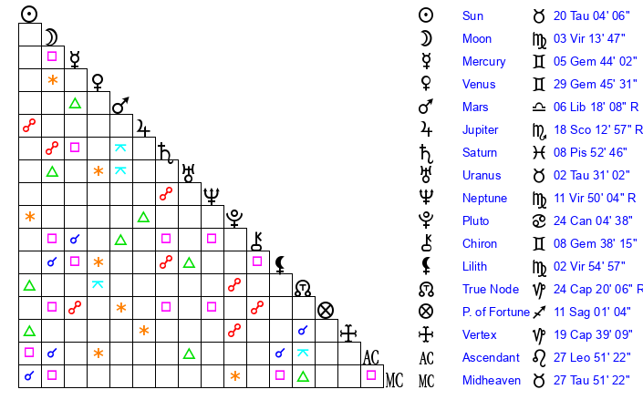 | Sun | 20 Taurus 4 | 21 Taurus 15 | 16 Leo 9 |