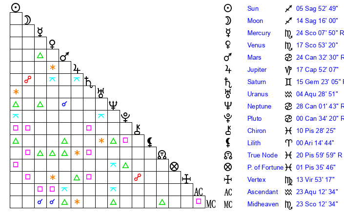 | Moon | 14 Sagittarius 18 | 11 Pisces 51 | 21 Capricorn 58 |