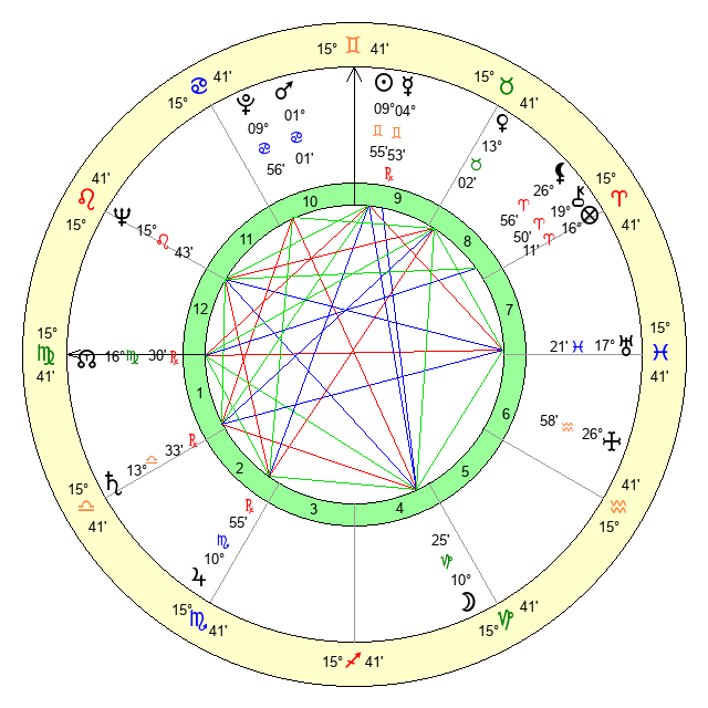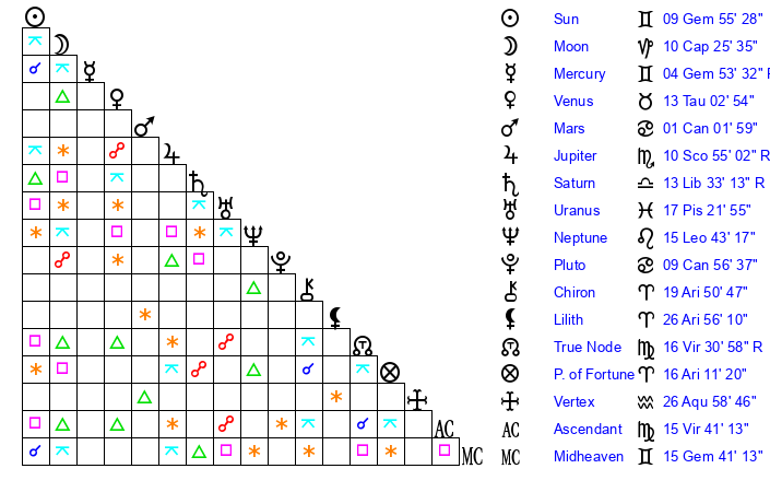 | Sun | 9 Gemini 55 | 11 Gemini 13 | 17 Virgo 41 |