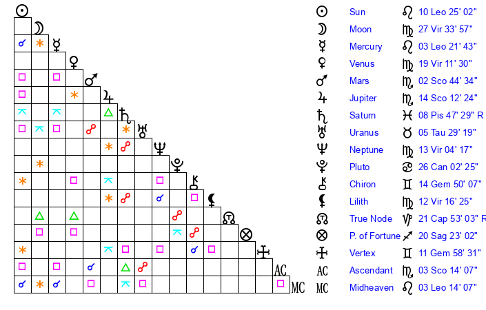 | Sun | 10 Leo 25 | 11 Leo 36 | 8 Scorpio 20 |