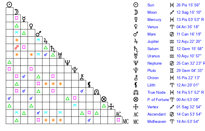 | Sun | 26 Pisces 16 | 27 Pisces 21 | 13 Cancer 45 |