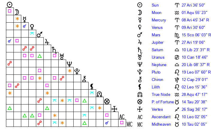 | Saturn | 10 Libra 58 | 26 Pisces 21 | 9 Libra 2 |