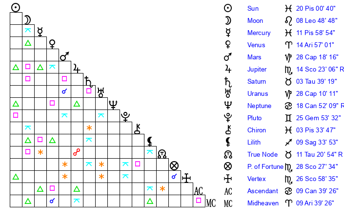 Sun | 20 Pisces 1 | 21 Pisces 22 | 10 Cancer 37 |