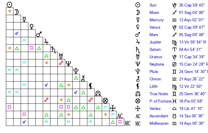 | Sun | 26 Capricorn 59 | 27 Capricorn 50 | 22 Taurus 16 |