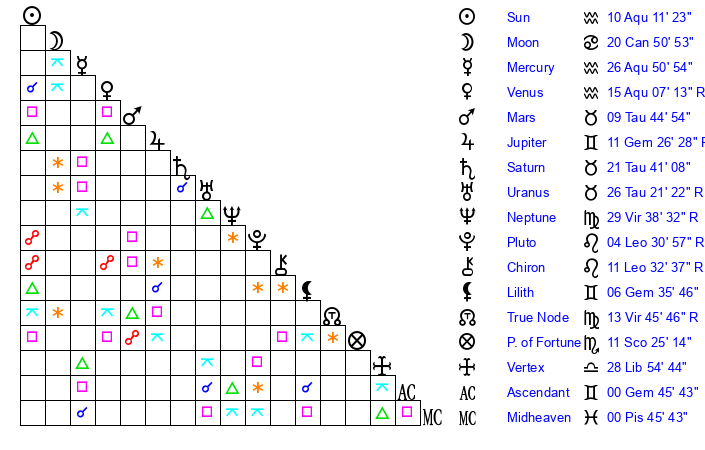 | Sun | 10 Aquarius 11 | 11 Aquarius 3 | 2 Taurus 54 |