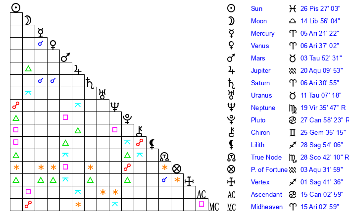 | Sun | 26 Pisces 27 | 27 Pisces 21 | 21 Gemini 3 |
