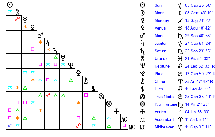 | Sun | 10 Capricorn 48 | 11 Capricorn 32 | 21 Aries 17 |