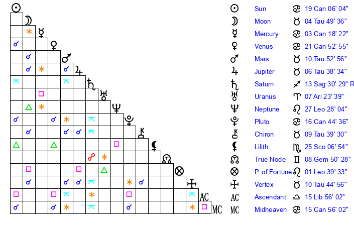 | Saturn | 13 Sagittarius 56 | 1 Aries 49 | 15 Sagittarius 40 |