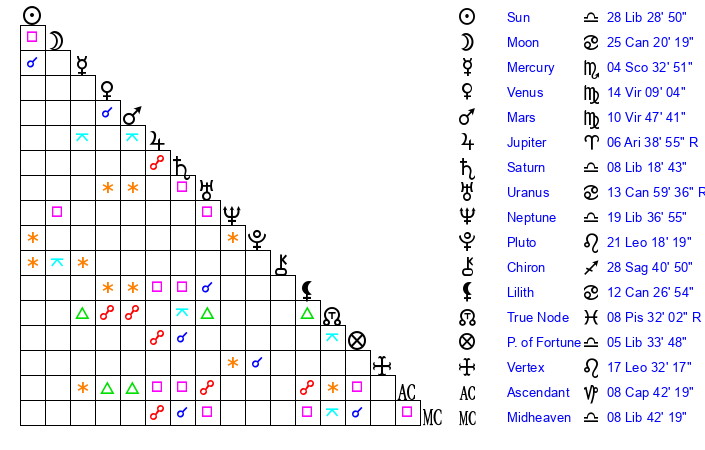 | Neptune | 19 Libra 37 | 29 Pisces 59 | 21 Libra 36 |