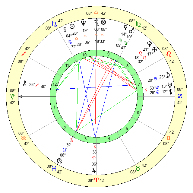 | Moon | 25 Cancer 23 | 12 Scorpio 33 | 19 Aries 26 |