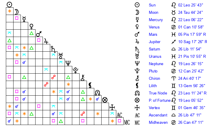 | Moon | 24 Taurus 47 | 14 Leo 26 | 8 Aquarius 5 |