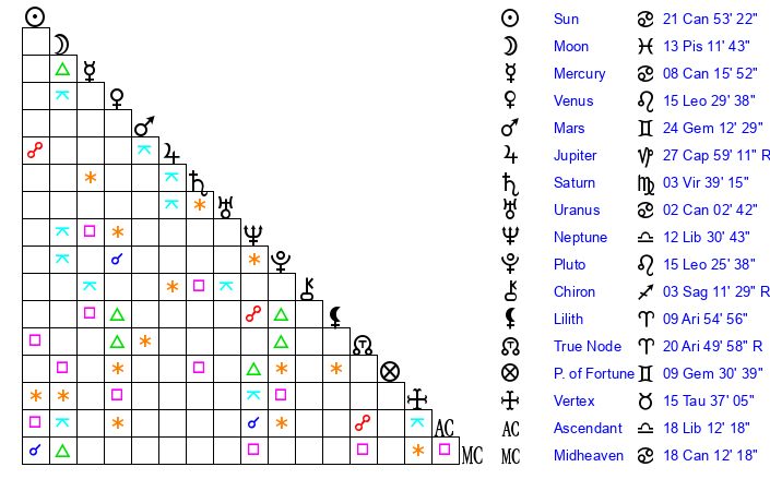 | Sun | 21 Cancer 54 | 22 Cancer 30 | 5 Libra 14 |