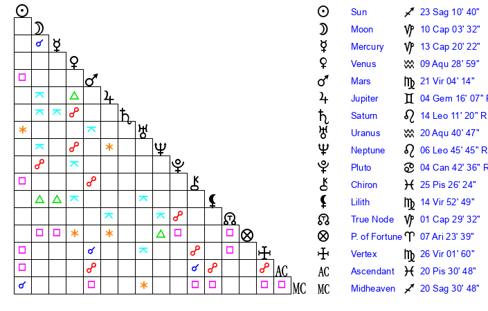 | Moon | 10 Capricorn 0 | 28 Gemini 39 | 7 Sagittarius 17 |