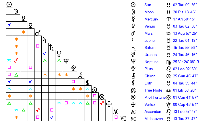 | Saturn | 16 Taurus 7 | 26 Pisces 53 | 26 Taurus 2 |