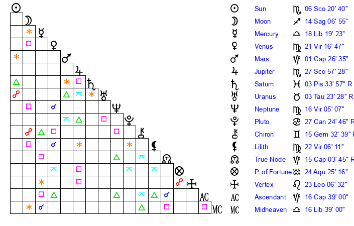 | Jupiter | 27 Scorpio 46 | 24 Cancer 56 | 16 Sagittarius 56 |
