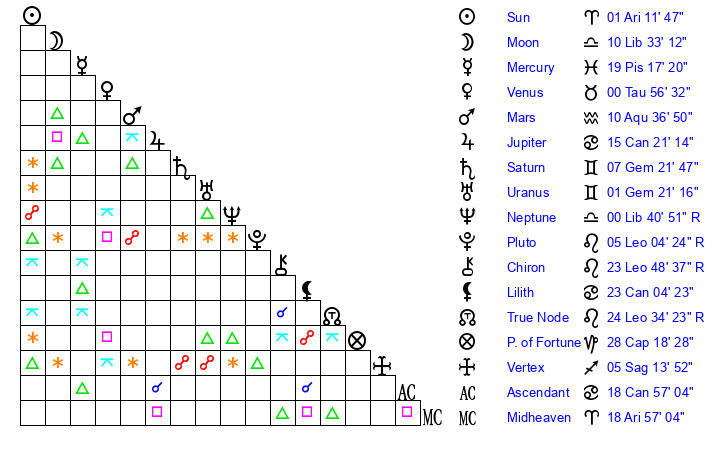 | Sun | 1 Aries 12 | 2 Aries 19 | 20 Gemini 51 |