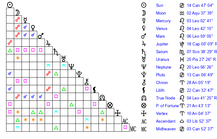 | Pluto | 13 Cancer 7 | 2 Aquarius 59 | 14 Cancer 45 |