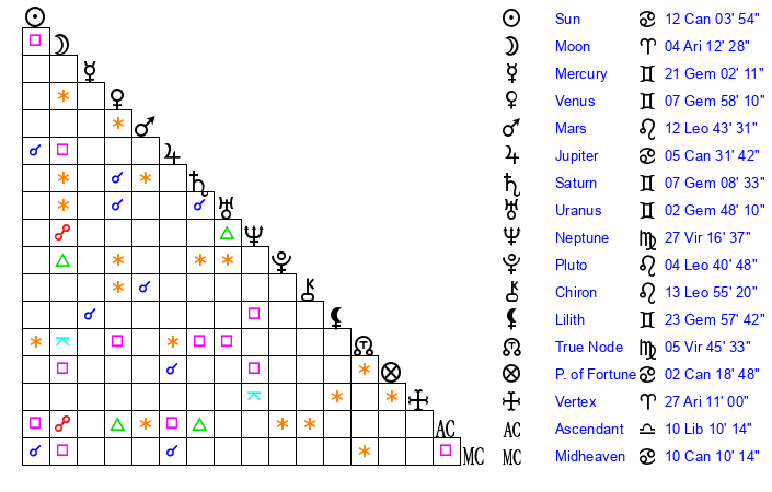 | Sun | 12 Cancer 4 | 12 Cancer 58 | 1 Libra 59 |