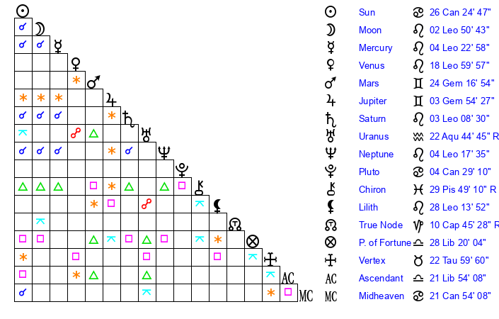 | Venus | 19 Leo 0 | 16 Gemini 52 | 27 Sagittarius 12 |