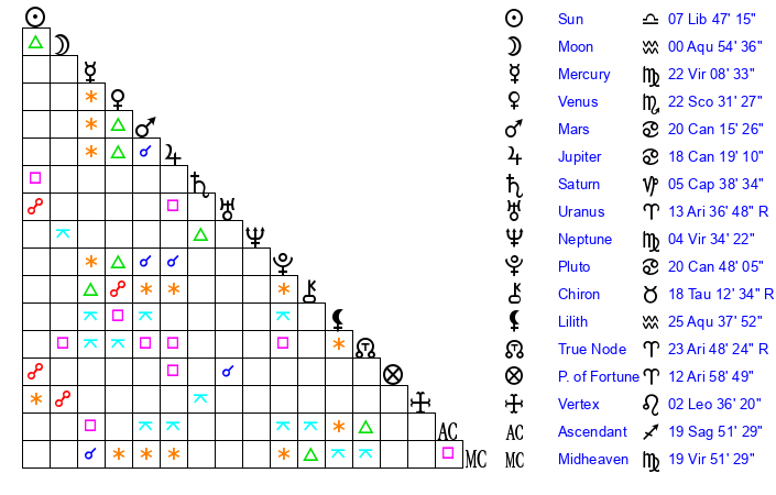 | Moon | 1 Aquarius 3 | 28 Capricorn 27 | 15 Cancer 23 |