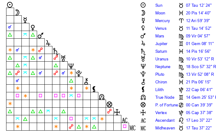 Venus | 11 Taurus 16 | 28 Pisces 26 | 24 Cancer 53 |