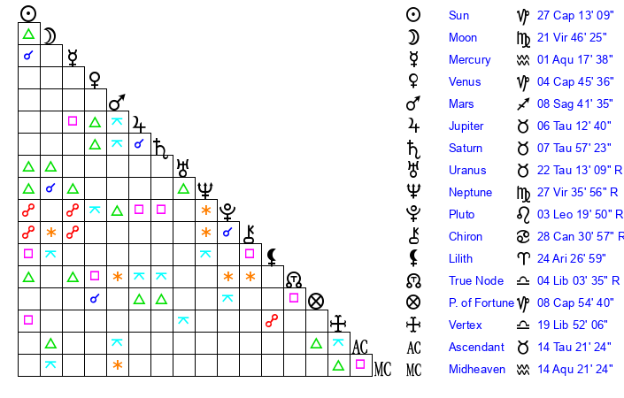 | Moon | 21 Virgo 39 | 12 Virgo 30 | 18 Libra 56 |