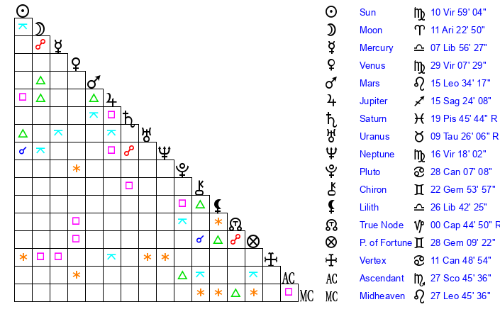 | Sun | 10 Virgo 59 | 11 Virgo 27 | 9 Sagittarius 21 |