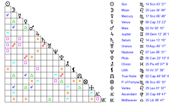 | Saturn | 14 Leo 56 | 25 Pisces 25 | 10 Leo 7 |
