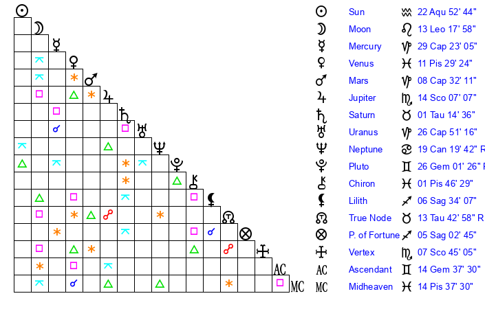 Sun | 22 Aquarius 53 | 24 Aquarius 14 | 14 Gemini 51 |