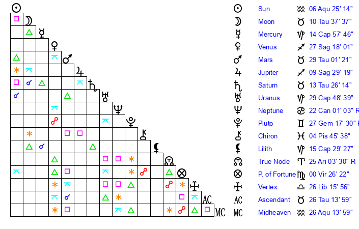 Moon | 10 Taurus 44 | 14 Capricorn 55 | 6 Cancer 6 |