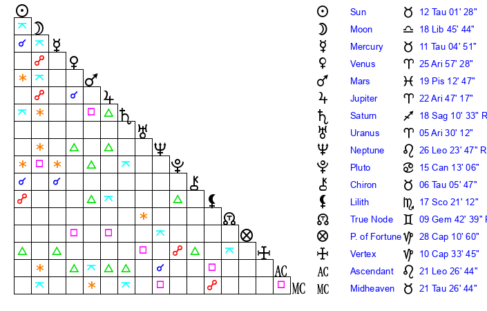 | Moon | 18 Libra 41 | 19 Cancer 42 | 1 Taurus 28 |