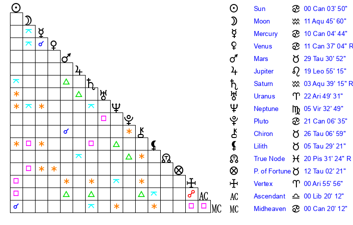 | Moon | 11 Aquarius 47 | 9 Taurus 9 | 25 Gemini 45 |
