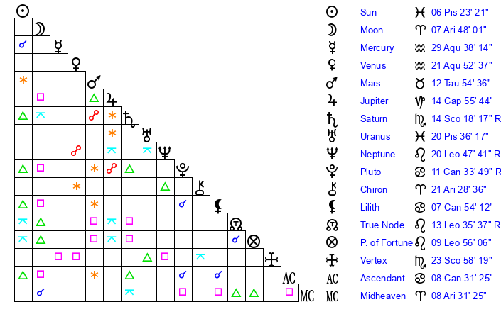| Sun | 6 Pisces 23 | 7 Pisces 8 | 14 Gemini 17 |