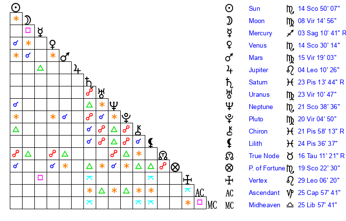 Neptune | 21 Scorpio 39 | 27 Pisces 22 | 23 Scorpio 38 |