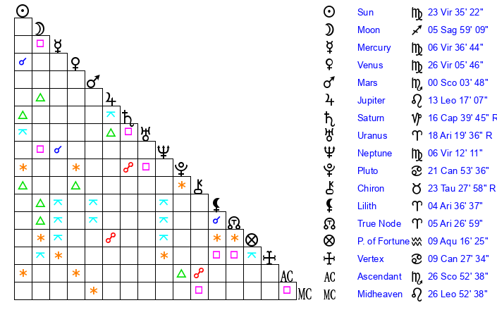 | Sun | 23 Virgo 35 | 24 Virgo 49 | 27 Sagittarius 36 |