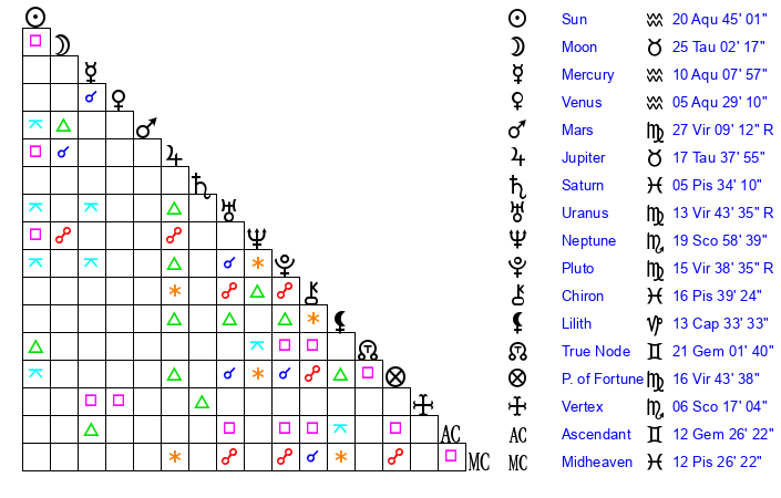 | Venus | 5 Aquarius 29 | 3 Aries 42 | 20 Aries 14 |