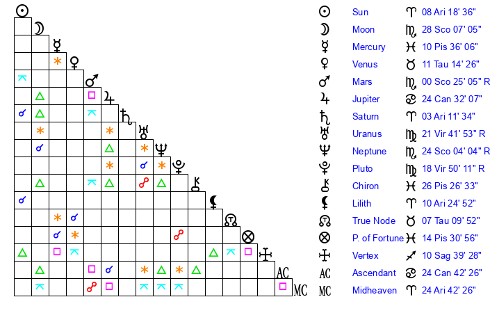 Sun | 8 Aries 19 | 9 Aries 15 | 4 Gemini 45 |
