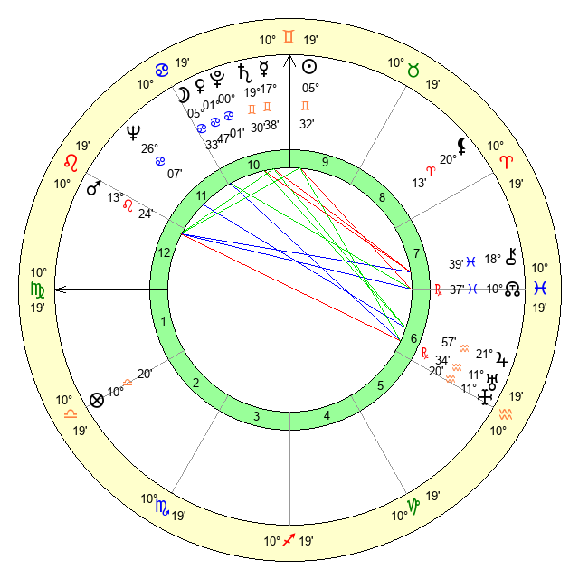 | Sun | 5 Gemini 32 | 6 Gemini 39 | 21 Virgo 59 |