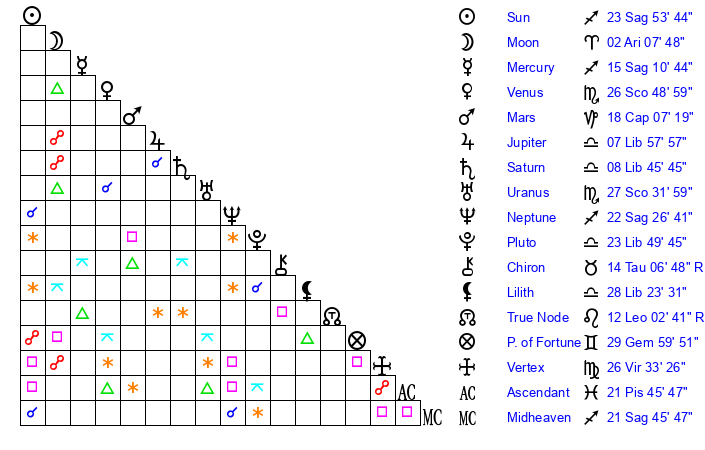 | Moon | 2 Aries 13 | 6 Scorpio 26 | 26 Scorpio 16 |
