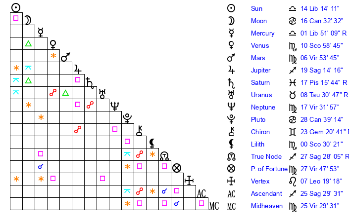 | Venus | 10 Scorpio 59 | 22 Virgo 21 | 28 Aquarius 21 |