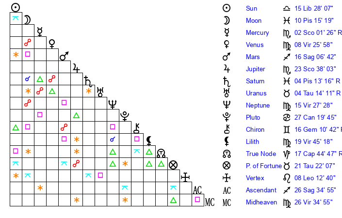| Neptune | 15 Virgo 27 | 0 Aries 18 | 16 Virgo 40 |