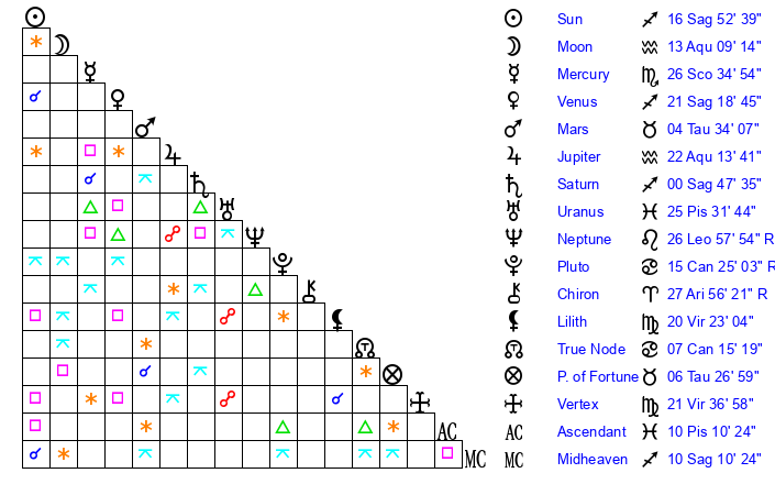 | Sun | 16 Sagittarius 53 | 18 Sagittarius 7 | 26 Pisces 7 |