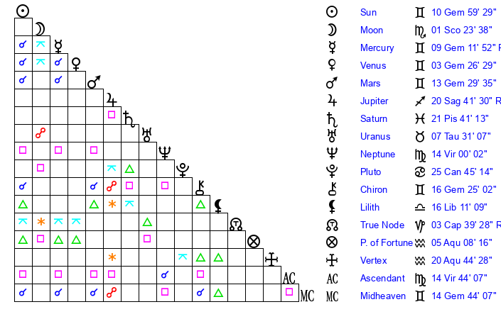 | Mercury | 9 Gemini 11 | 14 Gemini 36 | 2 Libra 25 |