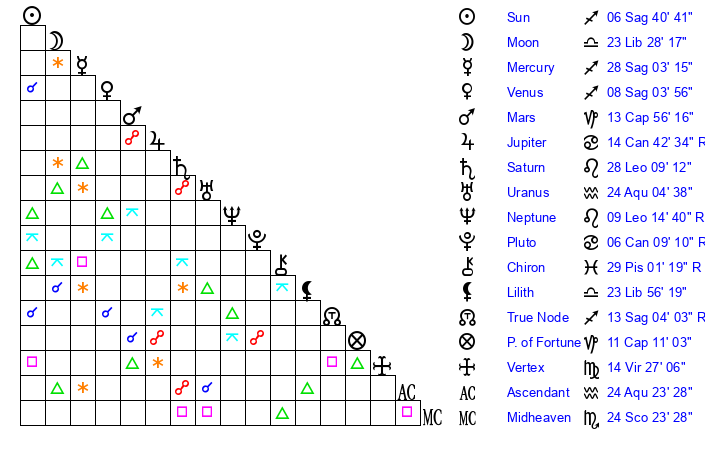| Sun | 6 Sagittarius 40 | 7 Sagittarius 58 | 24 Pisces 4 |