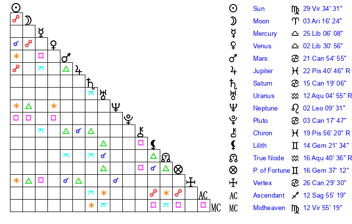 | Moon | 3 Aries 12 | 21 Libra 57 | 15 Aries 3 |