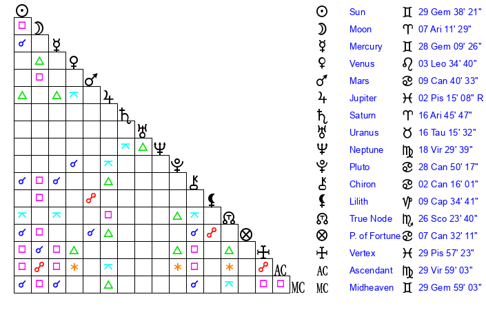 | Neptune | 18 Virgo 29 | 2 Aries 7 | 20 Virgo 58 |