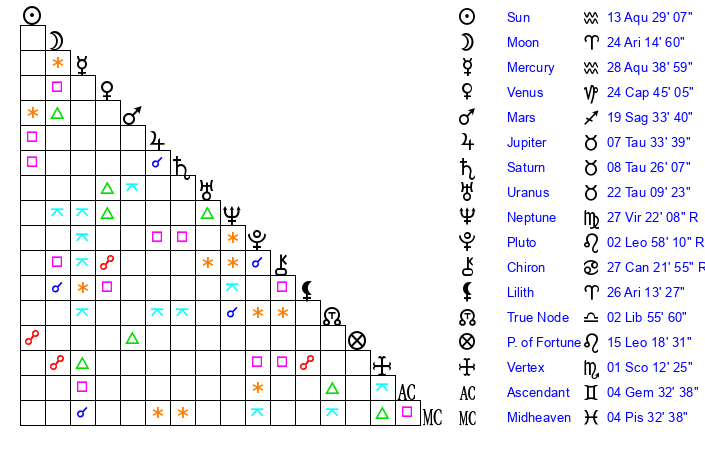 | Sun | 13 Aquarius 29 | 14 Aquarius 6 | 7 Taurus 2 |