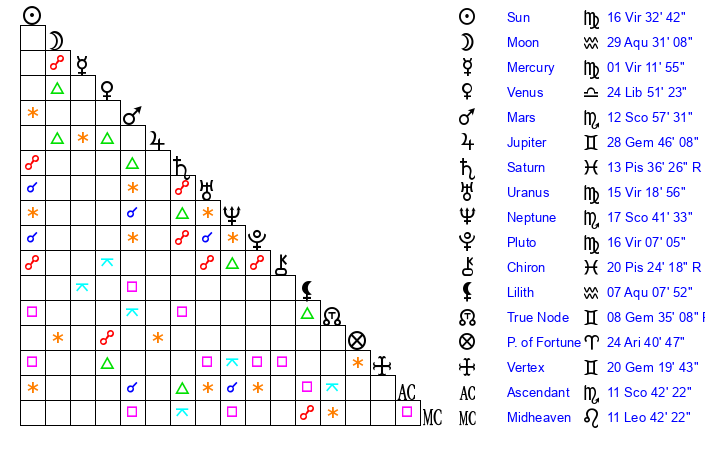 Pluto | 16 Virgo 8 | 1 Aquarius 37 | 18 Virgo 0 |